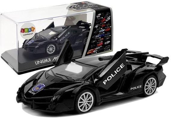 Spraw dziecku wspaniały prezent! Samochodziki to najpopularniejsze zabawki, które są uwielbiane przez chłopców w każdym wieku. Służą one do przeróżnych zabaw, które ogranicza tylko wyobraźnia dzieci. Wyjątkowy samochód policyjny do zabawy. Dzięki tej zabawce, Twoje dziecko będzie mogło bawić się godzinami w pościgi policyjne. Mnogość zabaw z pewnością sprawi, że dziecko nie będzie mogło oderwać się od swojego nowego pojazdu. Samochód wyścigowy z napędem pull-back wykonany został z plastiku na gumowych oponach. Zabawka rozbudzi w Twoim dziecku dużą ciekawość, która pozwoli rozwijać wyobraźnię dziecka i wpłynąć na prawidłowy rozwój. Autko posiada efekty świetlne oraz dźwiękowe podczas jazdy. Dźwięk sygnałów policyjnych podczas jazdy umili czas dziecku. Dodatkową zaletą są otwierane drzwi pojazdu. Autko wykonane w pięknym czarnym kolorze.
