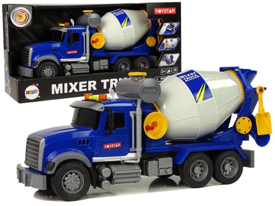 Dodatkowe funkcje jak efekty dźwiękowe i świetlne dodadzą efektu i realizmu całej zabawie. Koguty ostrzegawcze na górze informują o poruszaniu, na górze przyciski odpowiadają za dźwięki- klaksonu, uruchamianie silnika, cofania. Kolorystyka niebieska sprawi, że z daleka autko będzie widoczne. Betoniarka posiada frykcyjny napęd tylnej osi na popych, wystarczy nacisnąć na tył, puścić do przodu i cieszyć się prędkością.