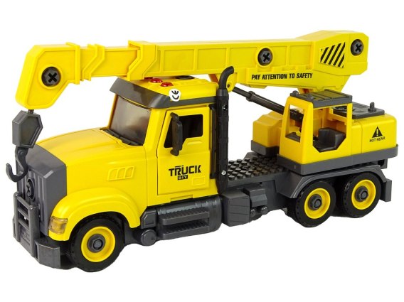 Zestaw zawiera żółtą ciężarówkę z dźwigiem o wymiarach 33 cm x 16 cm x 9,5 cm. Znajdziesz w niej 4 guziki, które aktywują 4 różne dźwięki, dodając autentyczności do zabawy. Ruchome elementy, takie jak drzwi i ruchomy dźwig, dodają dodatkowej atrakcji i zachęcają do eksploracji.
