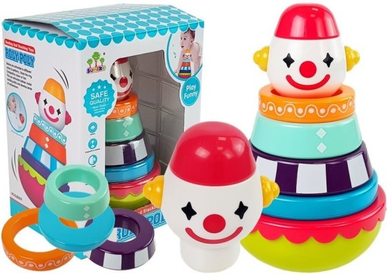 Ergonomiczny zaokrąglany kształt, delikatna kolorystyka, lekkość, przestrzenna forma, trwałość i bezpieczeństwo materiałów, wszystko to sprawia, że klaun idealnie nadaje się na ulubioną pierwszą zabawkę malucha. Zabawki takie jak pierścienie do układania są jedne z lepszych, ćwiczą zdolności motoryczne i koordynację ręka- oko. Mięśnie u niemowląt wzmacniają się poprzez wykonywane ćwiczenia w trakcie zabawy, takie jak chwytanie i puszczanie małych przedmiotów. Oprócz różnorodnej kolorystyki posiadają również wzory, co stymuluje jego zmysł wzroku. Może ułożyć super piramidę od najmniejszej do największej, a na szczycie umieścić głowę klauna.