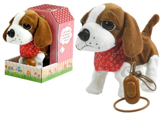 Brązowo-biały pies na smyczy wykonany jest z miękkiego i nietoksycznego, w 100% przyjaznego dla środowiska materiału, który jest bardzo przyjemny w dotyku. Zwierzak ma duże, ciemne oczy, wystający ogonek i duży nos, który delikatnie błyszczy. Ozdobiony jest czerwoną chusteczką, dodającą mu uroku. Zabawka posiada długą smycz zakończoną przełącznikiem, dzięki czemu dziecko w prosty sposób może sterować swoim pieskiem. Możliwość ta sprawia, że zabawa będzie wydawać się dziecku bardzo rzeczywista, a przede wszystkim ciekawa.