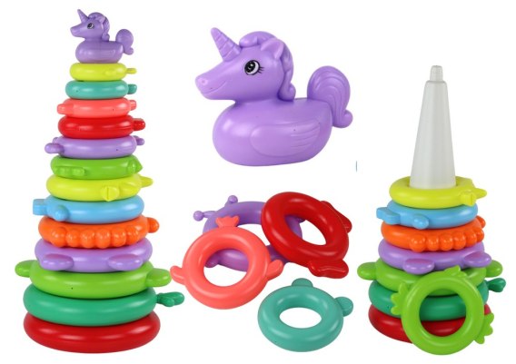 Piramidka z jednorożcem - zabawka i narzędzie do nauki! Maluch ułoży mini ringi od największego do najmniejszego, rozwijając logiczne myślenie i zdolności manualne. Uniwersalna i trwała, idealna do zabawy w różnych miejscach.