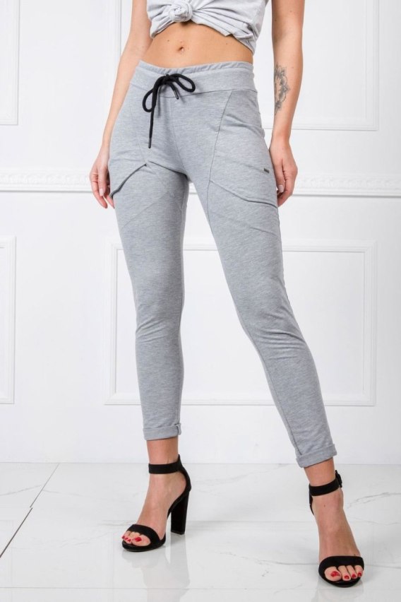 Modne spodnie dresowe to dzisiaj podstawa garderoby każdej kobiety lubiącej najnowsze trendy odzieżowe. Bez względu na to jaki styl ubierania się preferujesz na co dzień, to na pewno lubisz czasem założyć wygodne spodnie dresowe. Ten gładki model z naszej najnowszej kolekcji ubrań basic jest bardzo uniwersalny i ponadczasowy, ponieważ łatwo dopasujesz go do pozostałych elementów stroju. Ma bardzo modny fason z wąskimi nogawkami i podwyższoną talią, dzięki czemu pięknie podkreśla kobiecą sylwetkę i zaznacza jej proporcje. Ponadto spodnie dresowe mają gumkę w pasie oraz sznureczek, dzięki czemu możesz wygodnie dopasować je do kształtu swojej figury. Model zrobiony jest z wysokiej jakości materiału z dużą zawartością bawełny, który jest przyjemny w dotyku i przewiewny.