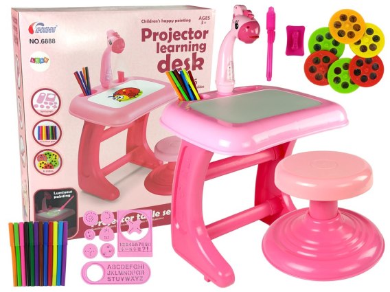 W skład zestawu wchodzi także mały taborecik, za pomocą którego Twoje dziecko będzie w stanie wygodnie siedzieć przy stoliku. Zarówno siedzisko, jak i stolik są utrzymane w różowych barwach, będzie idealnym uzupełnieniem wystroju pokoju dziecięcego. Na blacie stolika znajdują się dwie małe szufladki, w których można chować pisaki w pełnej gamie kolorów, są zawsze w zasięgu ręki. Projektor umieszczony na środku stolika przypomina wyglądem przyjazną żyrafę. Wyświetla najróżniejsze obrazki ze zwierzątkami oraz postaciami, które można przerysować na kartkę. Szablony w zestawie nauczą Twoje dziecko odpowiednich nazw figur geometrycznych oraz pisania literek.