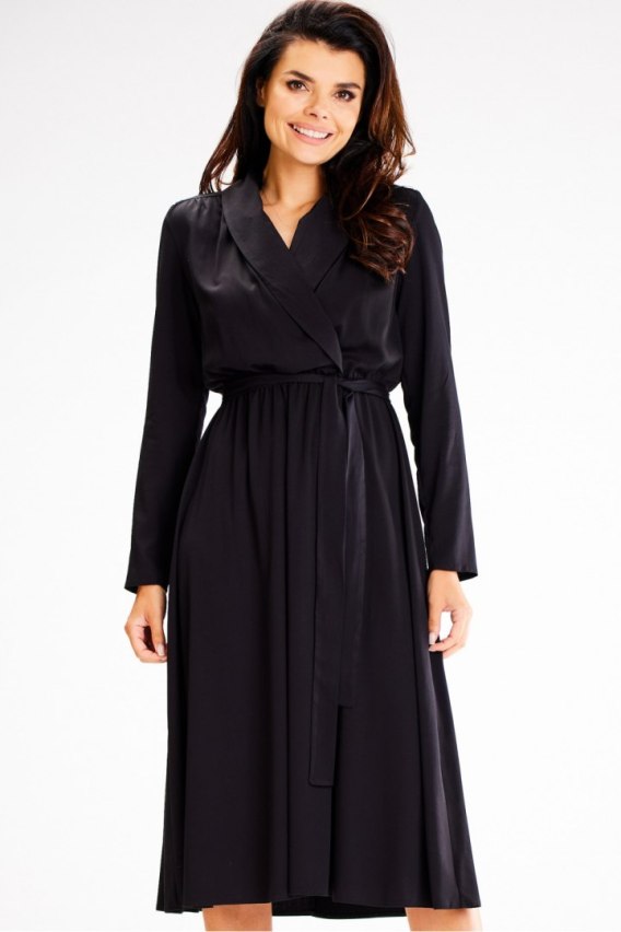 Sukienka elegancka z szalowym kołnierzem i rozkloszowanym dołem. Sukienka z gumką w pasie oraz wiązaniem. Na przodzie przy dekolcie i z tyłu ozdobiona marszczeniami.