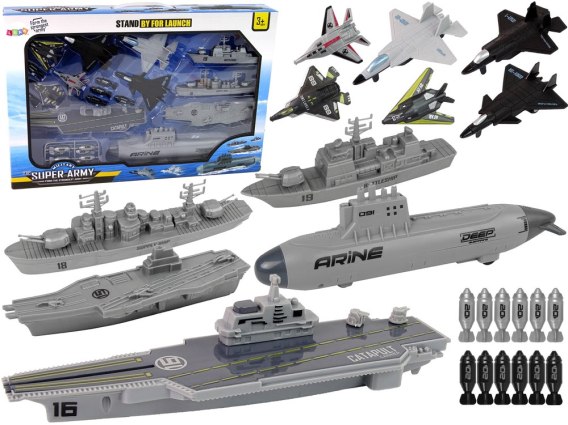 Czas rozpocząć bitwę morską ! Cały zestaw okrętów wojennych i odrzutowców pozwoli na taktyczne rozegranie bitwy. Mały strateg pobudzi swoją wyobraźnię. Zestaw jest rewelacyjny dla wszystkich fanów wojsk i żołnierzy oraz tych niezwykłych sprzętów.