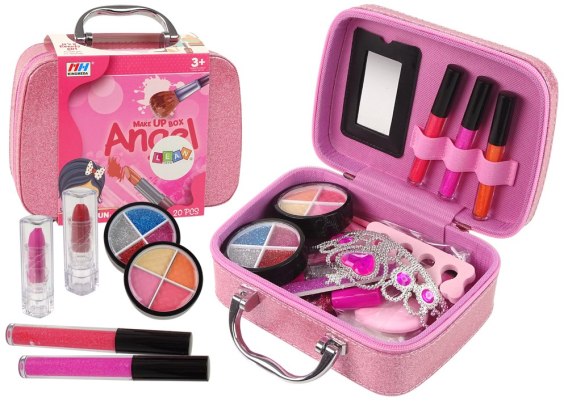 Oferowany zestaw z pewnością ucieszy każda małą damę i pozwoli na wykonanie ciekawych makijaży i stylizacji. Całość znajduje się w pięknym, brokatowym kuferku ze srebrną rączką. Sam kuferek jest bardzo elegancko i ciekawie wykonany. Po otwarciu można tam schować błyszczyki, szminki bądź inne mniejsze akcesoria do makijażu. W środku znajduje się duży wybór kosmetyków, rozpoczynając od lakieru do paznokci po piękne brokatowe cienie do powiek. Makijaż małej modnisi zrobi wrażenie na każdej z koleżanek.