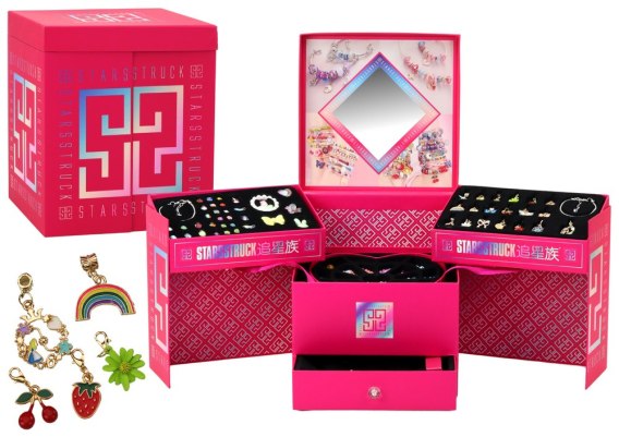 Na dolnej półce, którą możesz wysunąć, znajdziesz różowe opakowanie z kolorowymi sznureczkami, zawieszkami oraz złotym naszyjnikiem, który stanowi idealną bazę do zawieszania koralików i zawieszek, tworząc tym samym niepowtarzalne i wyjątkowe dzieła sztuki.