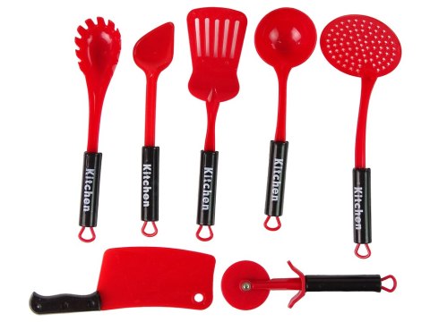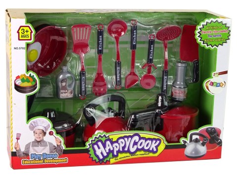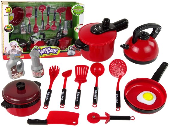 W zestawie znajdują się plastikowe, czerwone garnki, które swoim wyglądem idealnie naśladują rzeczywiste. Razem z garnkami, są akcesoria kuchenne takie jak: nalewajka, nóż, łyżka do makaronu i wiele wiele więcej.