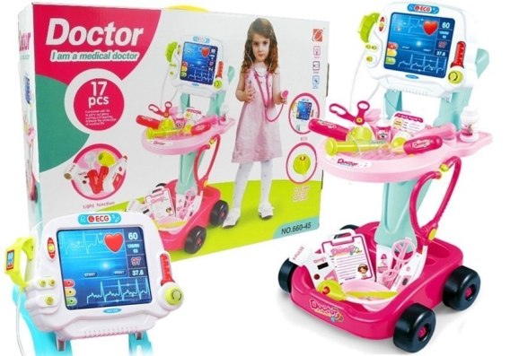 Bogato wyposażony zestaw lekarski. Idealny dla małych miłośników zabawy w lekarza. Stabilny wózek na czterech kółkach z rączką, dwoma półeczkami na przedmioty lekarskie i tablicą. EKG sprawdzi się idealnie dla przyszłych, małych lekarzy.